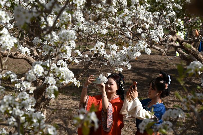 4月11日,人们在甘肃省敦煌市莫高镇莫高村的梨园中赏花拍照。新华社发(张晓亮 摄)