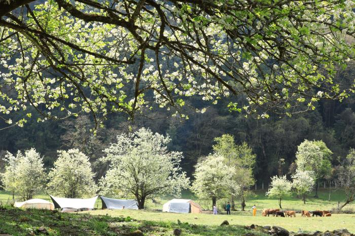 4月11日,游人在云南省腾冲市明光镇大竹坝棠梨花树间露营休闲。新华社发(龚祖金摄)