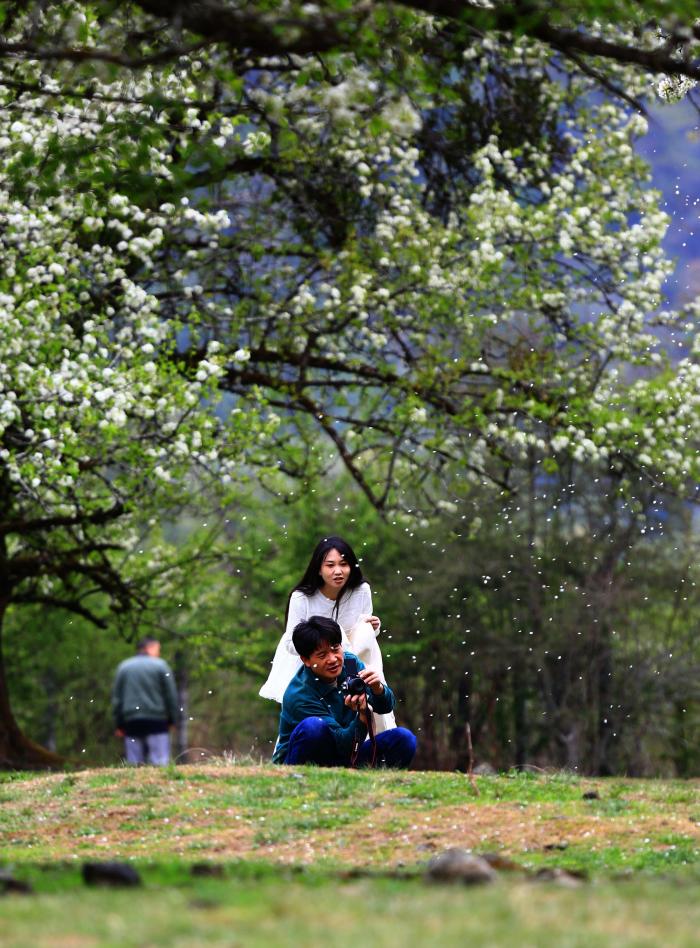 4月11日,游人在云南省腾冲市明光镇大竹坝棠梨花树下拍照。新华社发(赵辉摄)