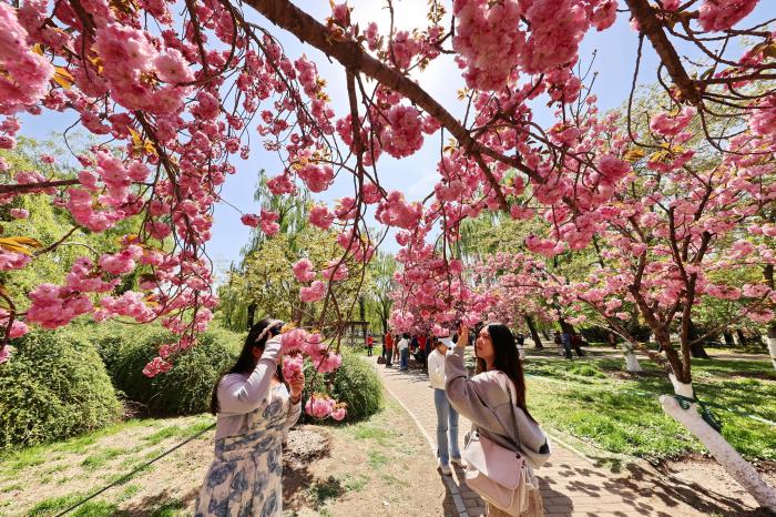 4月11日,游人在河北省石家庄市植物园赏花拍照。新华社发(陈其保摄)