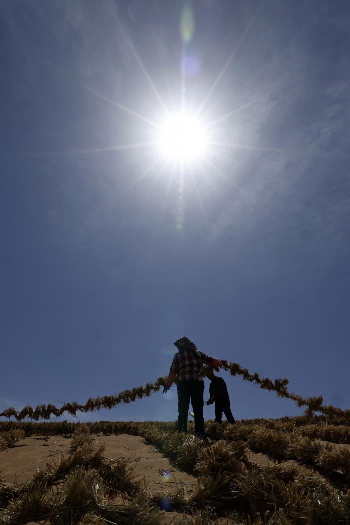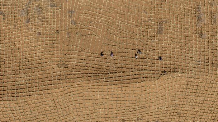 近日,宁夏中卫市组织治沙工人开展春季宁夏境内腾格里沙漠固沙锁边带改造提升工作,铺设新式草方格沙障,不断巩固治沙成果,筑牢黄河上游生态屏障。