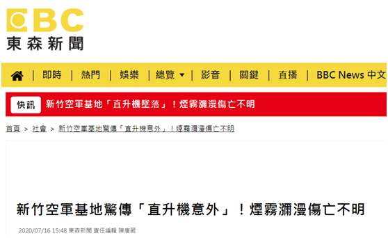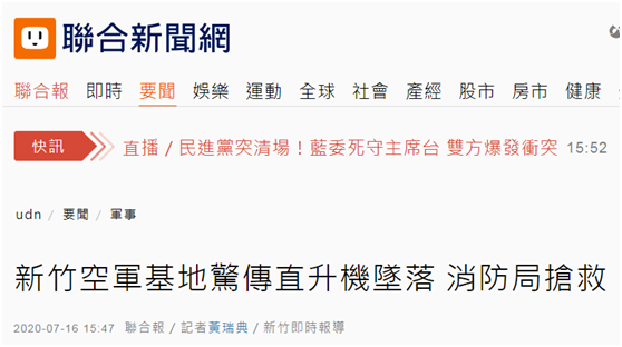 据台湾“联合新闻网”“东森新闻”报道,台湾新竹市消防局今天(16日)下午3点28分接到火警称新竹空军基地有直升机坠落。