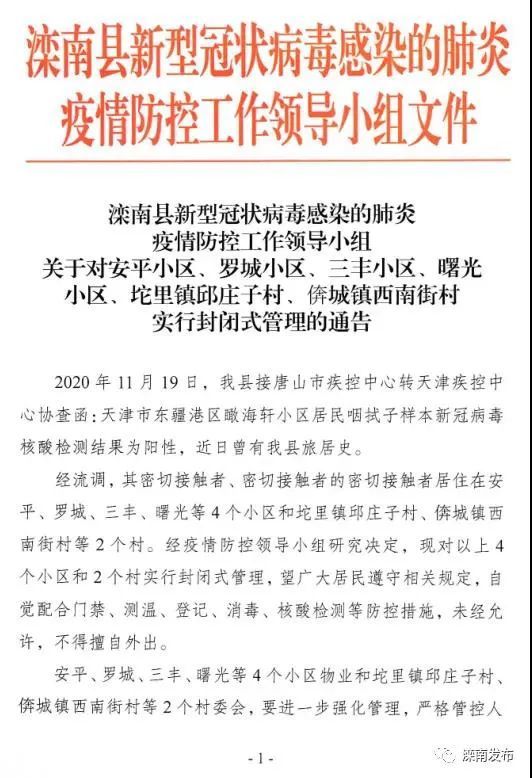 同时,河北省唐山市滦南县发布通告紧急寻找相关密切接触者,并对天津病例杨某某的密切接触者、密切接触者的密切接触者所在的滦南县安平小区、罗城小区、三丰小区、曙光小区和坨里镇邱庄子村、倴城镇西南街村实行封闭管理,居民未经允许,不得擅自外出。