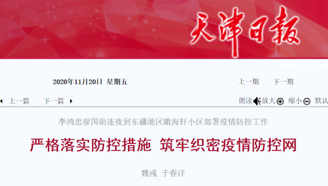 政知道(微信ID:upolitics)了解到,此次疫情传播情况系昨晚发现。11月19日夜,在接到相关疫情报告后,天津市委书记李鸿忠,市委副书记、市长廖国勋第一时间赶往该社区封控现场调研检查,研究部署疫情防控工作。