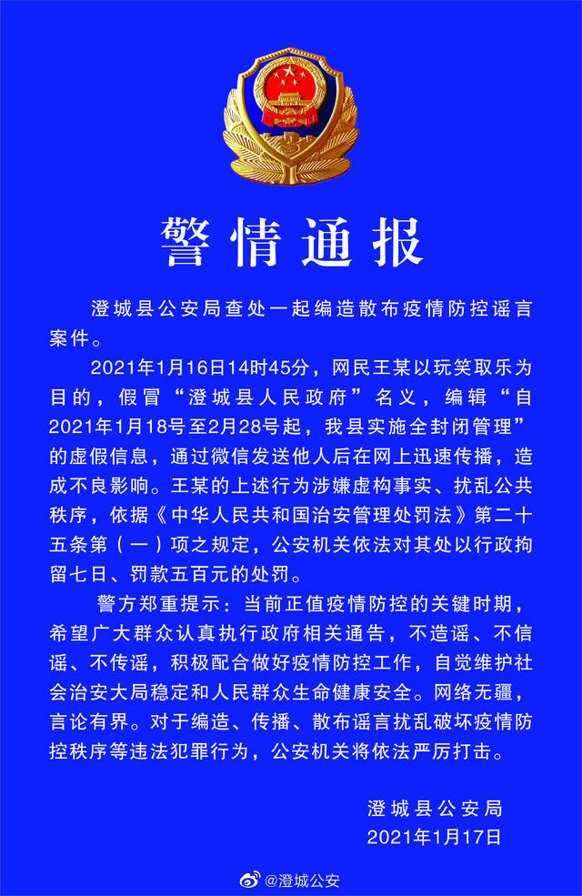 据澄城县公安据通报,2021年1月16日14时45分,网民王某以玩笑取乐为目的,假冒“澄城县人民政府”名义,编辑“自2021年1月18号至2月28号起,我县实施全封闭管理”的虚假信息,通过微信发送他人后在网上迅速传播,造成不良影响。王某的上述行为涉嫌虚构事实、扰乱公共秩序,依据《中华人民共和国治安管理处罚法》第二十五条第(一)项之规定,公安机关依法对其处以行政拘留7日、罚款五百元的处罚。