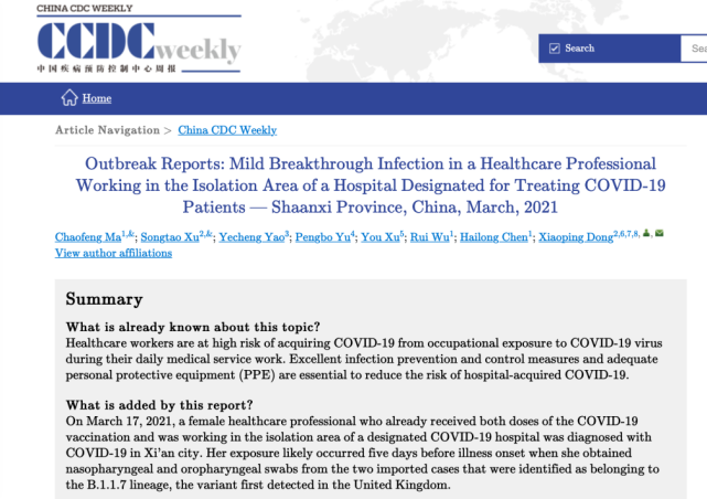 4月20日,《中国疾病预防控制中心周报(英文)》在线发表了西安市一名医院检验人员在已接受了两剂COVID-19疫苗后,仍感染新冠病毒的调查报告。原因是她在发病前5天可能暴露于携带有英国变异病毒环境条件中。