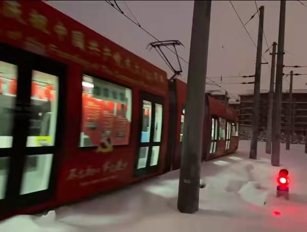 当时在电车上的乘客李女士表示,她从综合保税区站上车后,车辆行驶不久就停下了。“随后就听到车内传来司机的广播,他告诉我们,现在车底积雪较多,车辆无法前进,需要乘客们一起轻微跳动,震掉车底的积雪才能继续行驶。由于大雪的缘故,老人小孩在早高峰很少出行,车上也基本都是年轻人。听到广播后,我们都站起来了,听从司机的口令,一起跳了三四次。”