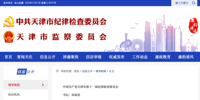 据天津市纪委监委网站领导机构一栏显示,陈辐宽已经担任天津市纪委书记、监委主任候选人。