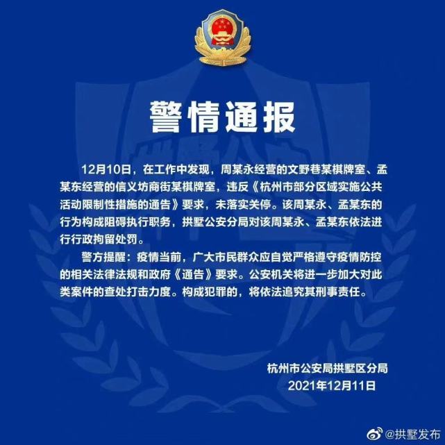 杭州市公安局拱墅区分局12月11日通报,12月10日,在工作中发现,周某永经营的文野巷某棋牌室、孟某东经营的信义坊商街某棋牌室,违反《杭州市部分区域实施公共活动限制性措施的通告》要求,未落实关停。该周某永、孟某东的行为构成阻碍执行职务,拱墅公安分局对该周某永、孟某东依法进行行政拘留处罚。