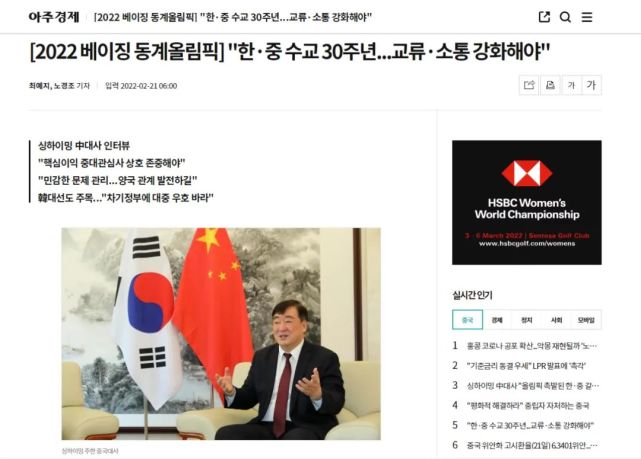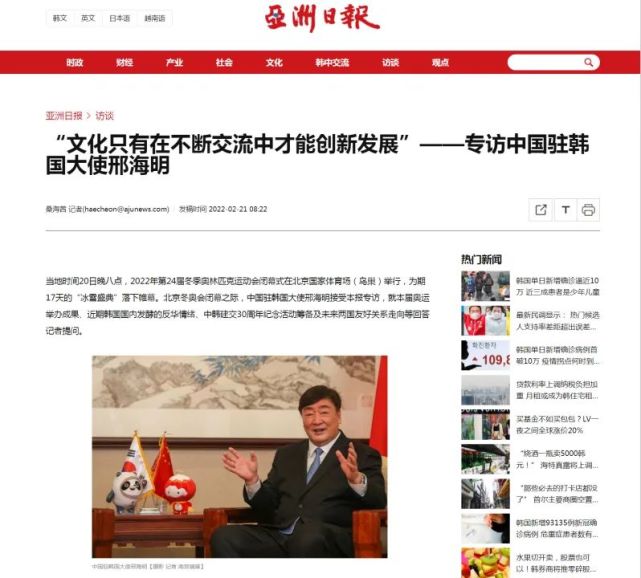 2月21日,韩国《亚洲日报》《亚洲经济》在其纸质报刊和官方网站分别以中文、韩文发布对邢海明大使专访。邢海明大使在专访中回顾北京冬奥会盛况,介绍中国经济形势,并就中韩关系、产业链供应链、民间友好等问题等回答记者提问。采访实录如下: