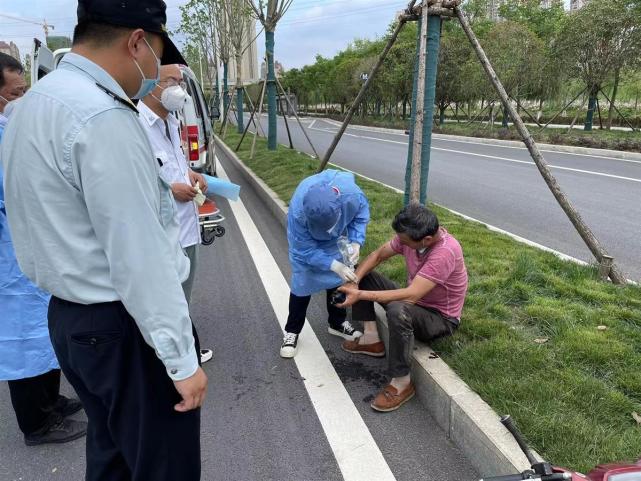 4月26日下午3时许,东西湖区径河城管队员王思泽、程志豪和李俊3人进行日常“路长制网格化”巡查时,在金山大道新城十二路至四环线桥下路段处的马路站石绿化带处发现一中年男子仰卧,脸上、身上等部位有血迹,还有一辆电动车倒在身边不远处。
