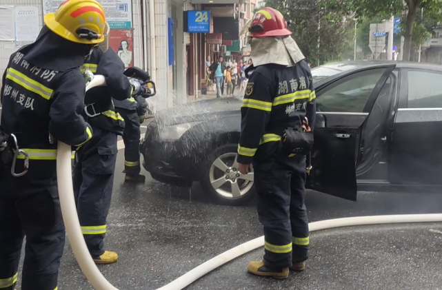 约5分钟后,永兴县消防救援大队的消防员赶到现场。根据现场情况,消防员迅速架设起水枪,对准车头起火部位进行喷射。由于长时间燃烧,车辆引擎盖已无法正常开启,为最大程度保持车辆完整性,待明火被扑灭后,消防救援人员小心翼翼地将起火的车辆引擎盖掀起一条细缝,将水枪移至引擎盖前方,冷却起火车辆,防止复燃。15分钟后,火情被成功处置,现场无人员受伤。