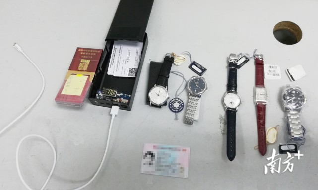 5月7日晚,澳门女子许某经拱北口岸旅检现场海关“无申报通道”进境,被现场关员截查。许某过关时行李较少,随身携带的手机正在连接着充电宝充电,但电量却几乎已耗尽。这一反常情况引起了关员的注意。关员进一步查验,充电宝X光机图像显示异常。拆开盒体之后,关员发现充电宝内部除了一个电池外,还有5只用薄膜包裹严实的手表和数张保修卡,其中浪琴手表3只、欧米茄手表2只。在此前的4月22日晚上,闸口海关关员还查获内地女子沈某以上述相同手法,在充电宝盒体空间内藏匿走私数张游戏卡进境,数量共计131张。