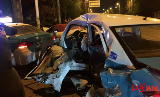 凌晨1时43分许,“砰”的一声巨响,悲剧瞬间发生。一辆车牌号为川A42××7的保时捷跑车闯红灯后,撞上了蒋学品驾驶的出租车,接着又撞上黄某驾驶的另一辆出租车。