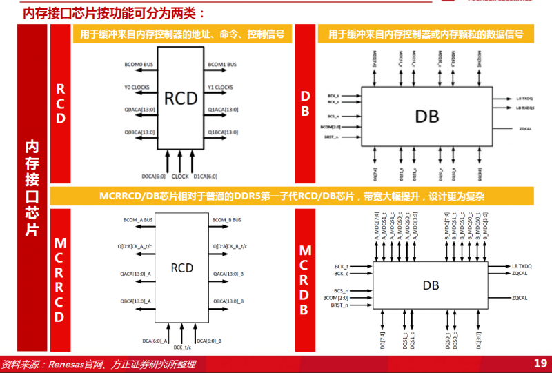 公开资料显示,内存接口芯片按功能分类,一是寄存缓冲器(RCD,又称“寄存时钟驱动器”),用来缓冲来自内存控制器的地址/命令/控制信号;二是数据缓冲器(DB),用来缓冲来自内存控制器或内存颗粒的数据信号。