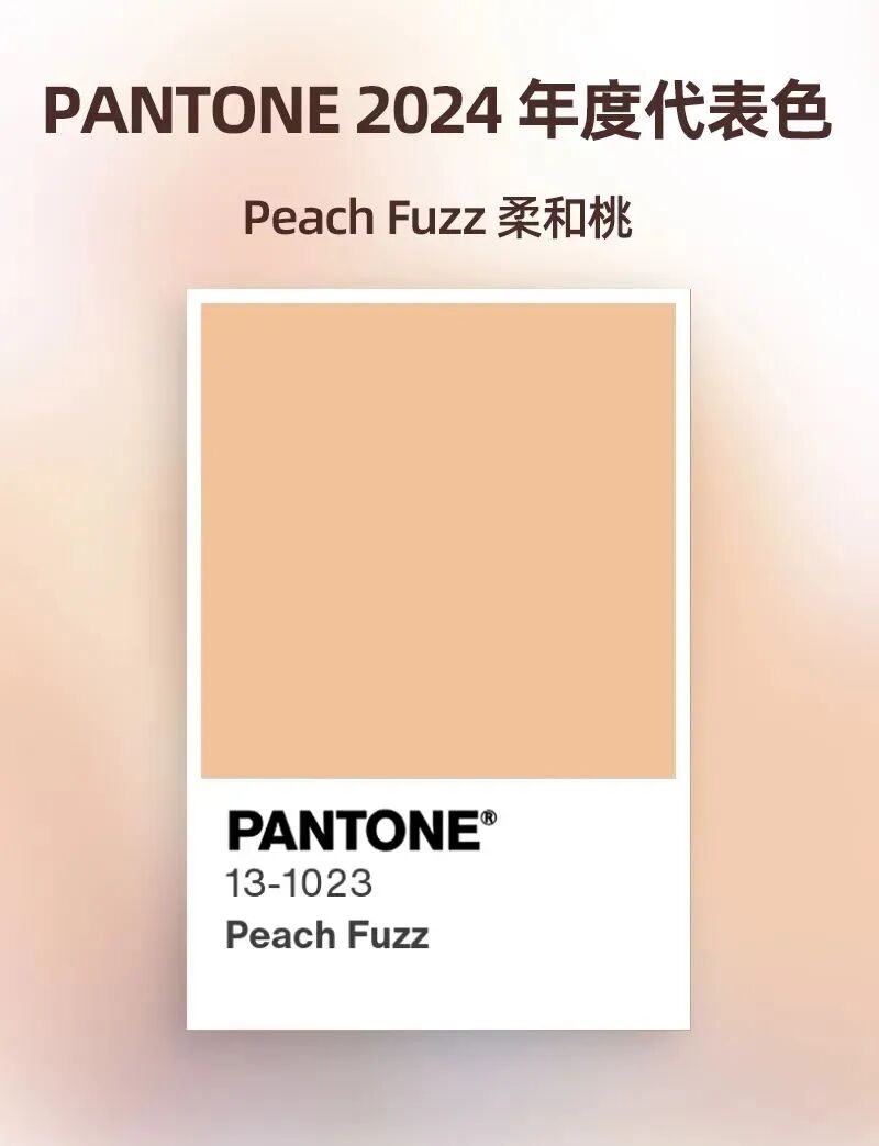 PANTONE(潘通)发布了2024年度代表色——柔和桃(Peach Fuzz),是一种散发着温暖和现代优雅气息的颜色。潘通年度流行色与当下现实密不可分,在2024年,潘通希望用这一抹柔和蜜桃色作为载体 ,在千变万化的当下和不可预知的未来里,用它宁静柔和的力量疗愈每个人的身心,也是对内在平静与归属感的追求。