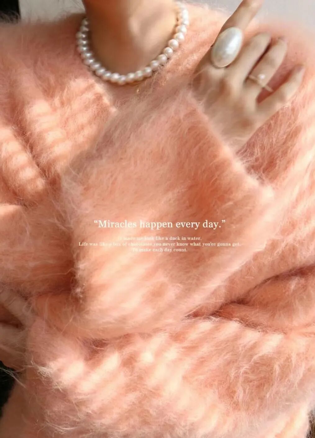 柔和桃是一种令人陶醉的橘粉调,带着点短绒毛的柔和桃色毛衣,很难不让人联想到蜜桃上的小绒毛,冬日阳光照耀下暖融融,有一种想要拥抱的冲动,充满宁静的幸福感。尤其马海毛的毛衣更能凸显柔和桃色的柔软与宁静,点缀上珍珠配饰,贵气感与温柔感相互融合。