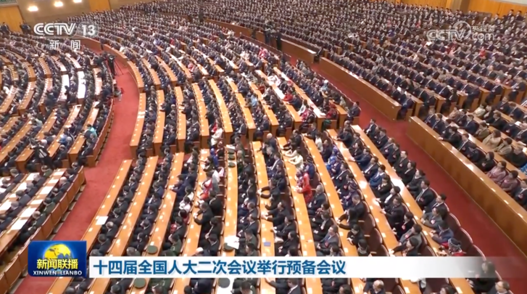 据《新闻联播》报道,十四届全国人大二次会议4日上午在北京人民大会堂举行预备会议。