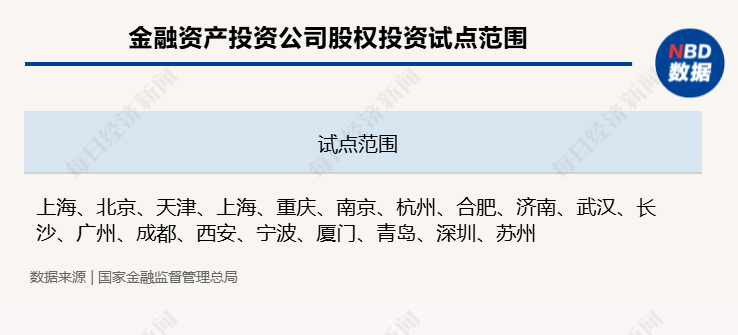 据悉,金融资产投资公司股权投资试点范围由上海扩大至北京、天津、上海、重庆、南京、杭州、合肥、济南、武汉、长沙、广州、成都、西安、宁波、厦门、青岛、深圳、苏州等18个城市。