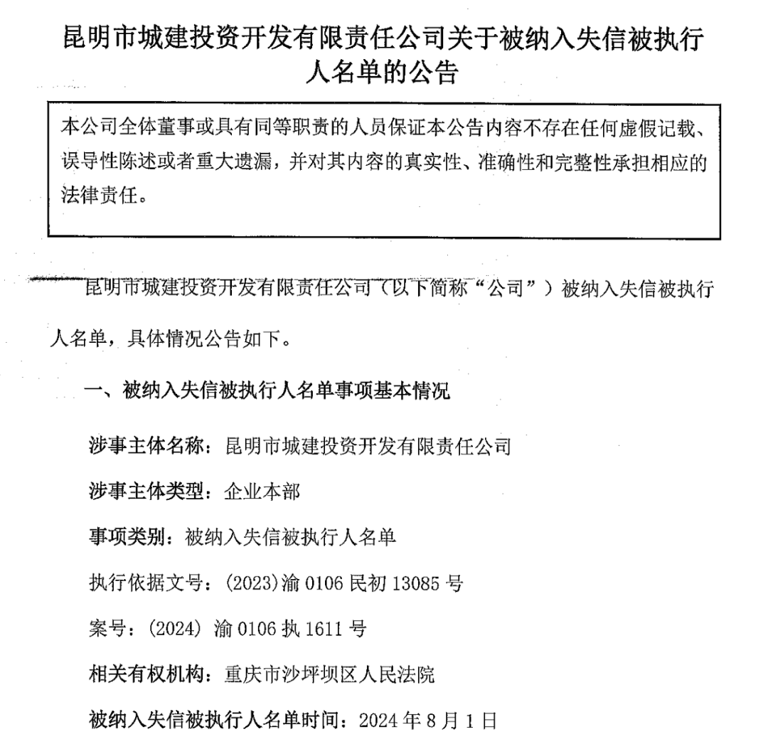 8月9日,昆明城投在北京金融资产交易所发布公告称,公司因未能偿还重庆建工第二建设有限公司垫付款2600万元及相关费用,被重庆市沙坪坝区法院列为失信被执行人,并被查封了20处房产准备进行司法拍卖,同时法定代表人杨晓斌被限制高消费。