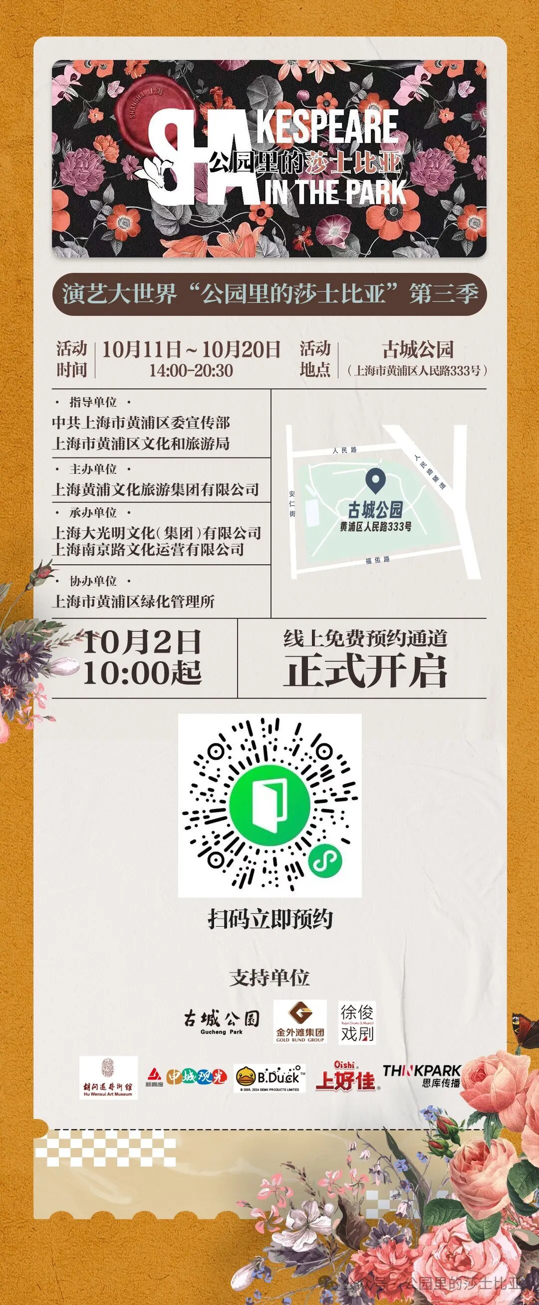 黄浦区新闻办介绍,演艺大世界“公园里的莎士比亚”(第三季)演艺市集于10月11日-20日期间亮相上海市黄浦区古城公园。所有演艺市集活动向市民游客免费公益开放。详见: