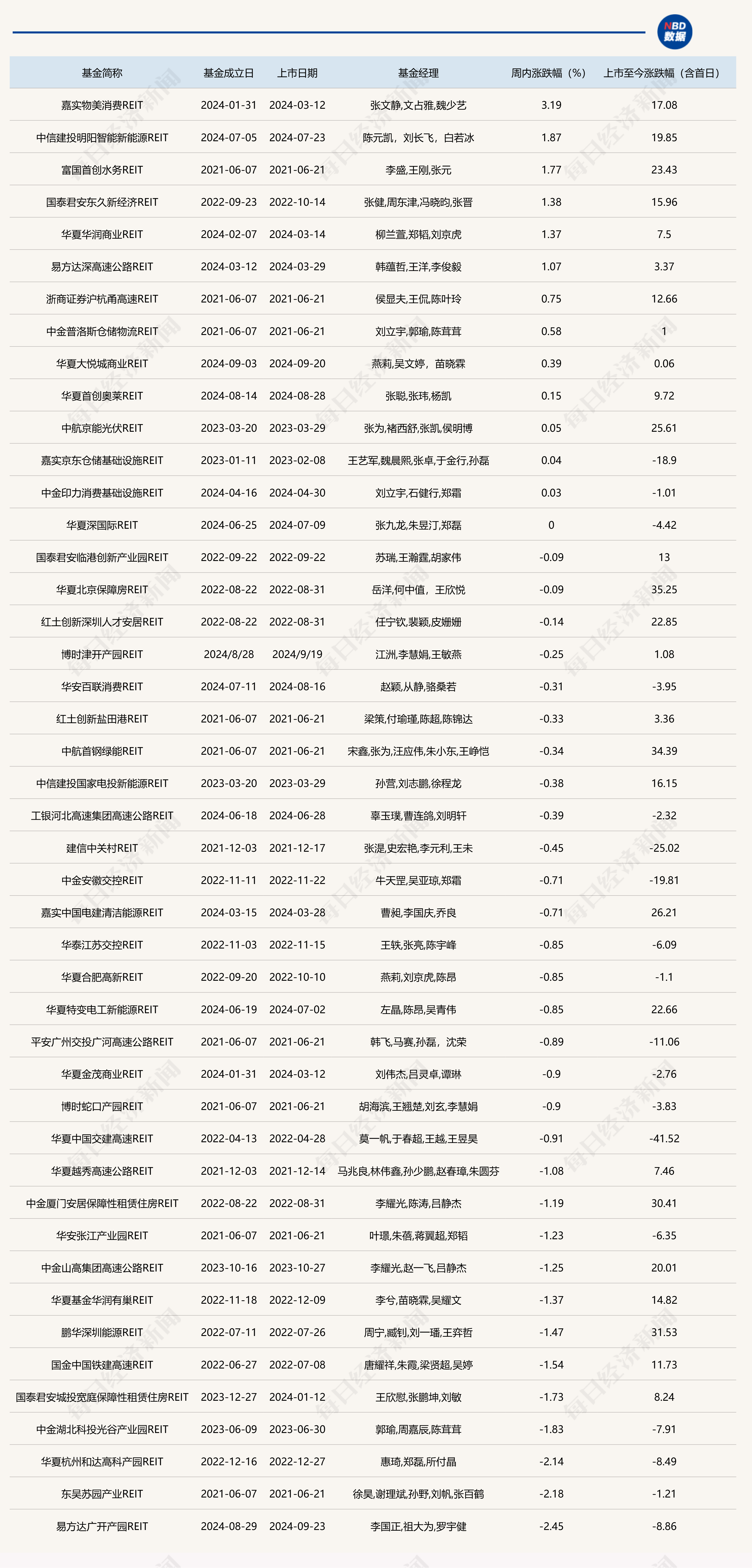 具体产品方面,根据Wind数据,上周环比上涨的减少至13只,其中嘉实物美消费REIT、中信建投明阳智能新能源REIT和富国首创水务REIT领跑市场,涨幅分别为3.19%、1.87%和1.77%。