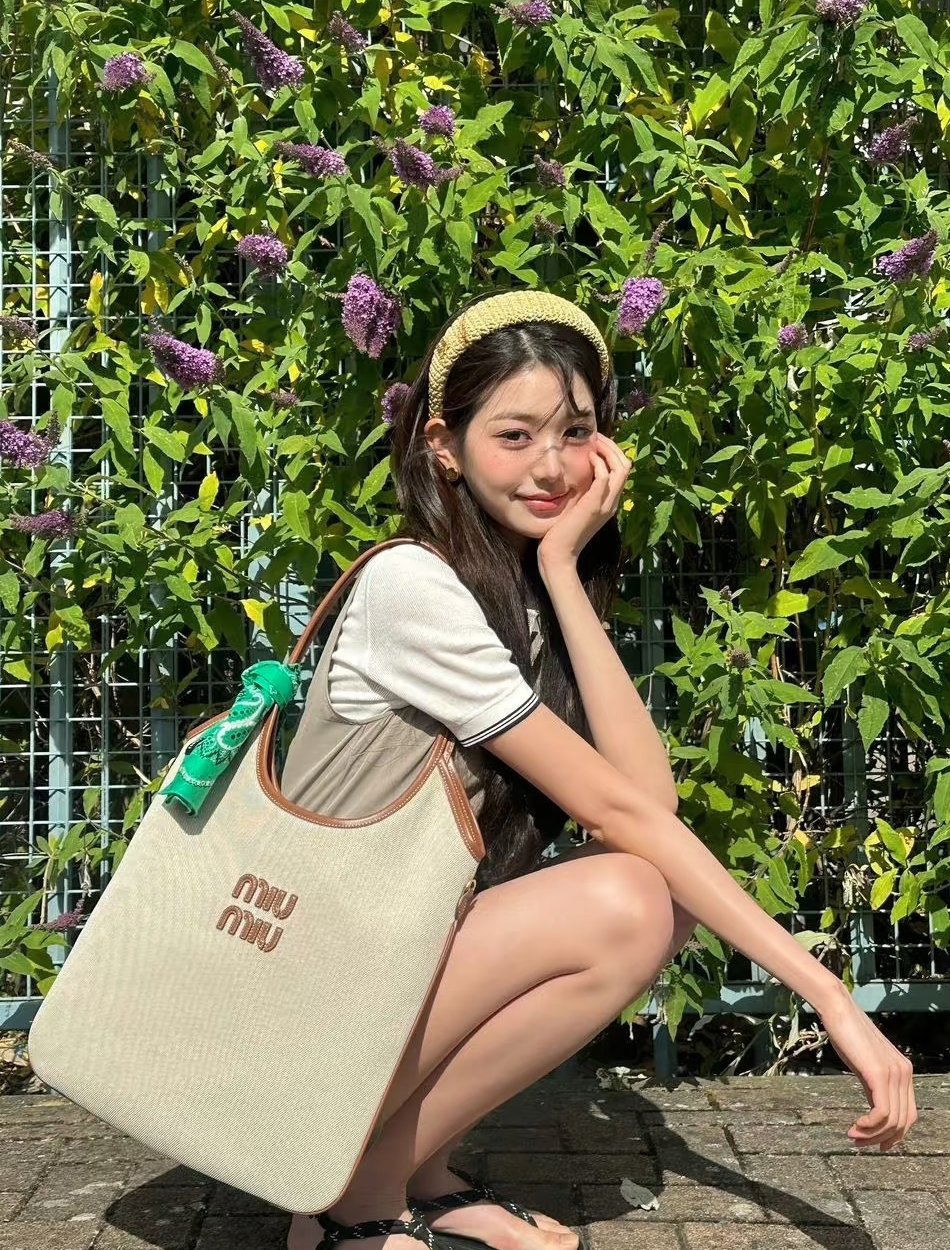 Miumiu的帆布包同样也是米白色帆布拼棕色皮质包边,包包自重轻,近年miu风盛行,网红博主都纷纷抢购,托特包款式和公文包款式各有千秋,托特包的长包型容量大,更显随意松驰,公文包的包型更加规矩,miu风甜美少女穿搭或是巴恩风穿搭,与这款包包的搭配都很时尚。