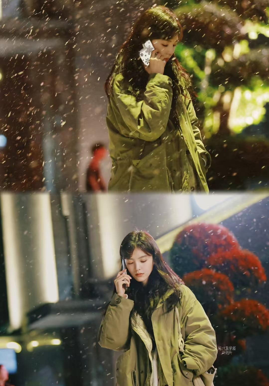 温以凡的这一套穿搭像极了雪夜中刚下班的普通人,一件足够御寒的军绿色长款外套,内搭选择白色,白色的T恤搭配白色的阔腿裤,与军绿色碰撞,明暗呼应。这套穿搭,没有华丽的装饰,没有刻意的搭配,却处处体现着对生活的热爱和对美的追求。