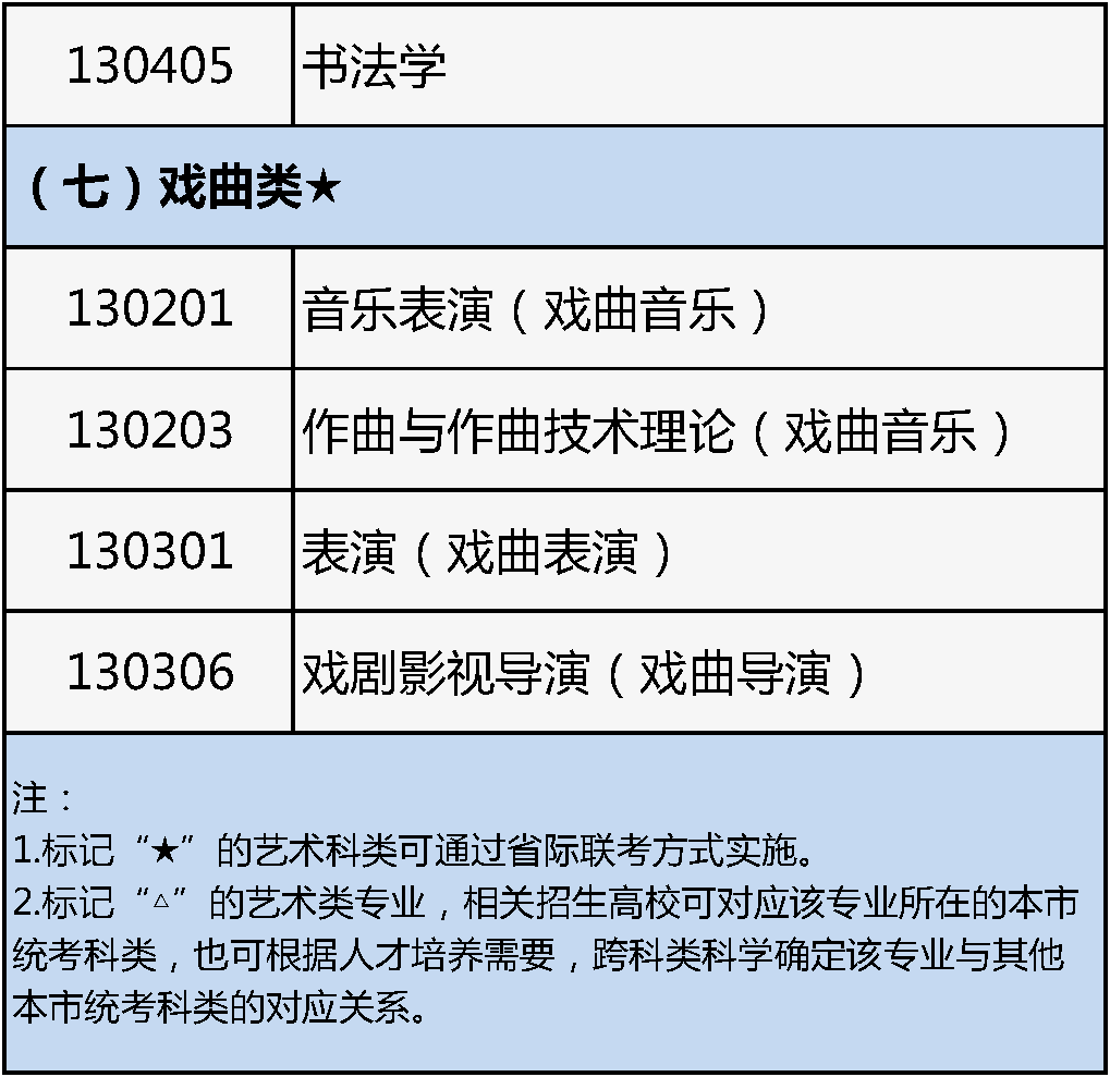 2.7个艺术类考试科类下设的艺术类专业招生实行“文化素质+专业能力”的考试评价方式。招生高校可根据自身办学定位和人才培养实际,对考生专业能力提出艺术科类相对应的专业要求,并使用北京市统考成绩、省际联考成绩或高校校考成绩作为专业成绩进行录取。专业目录中标记“★”的科类为戏曲类,可通过省际联考方式实施,标记“△”的艺术类专业,相关招生高校可对应该专业所在的本市统考科类,也可根据人才培养需要,跨科类科学确定该专业与本市统考科类的对应关系。