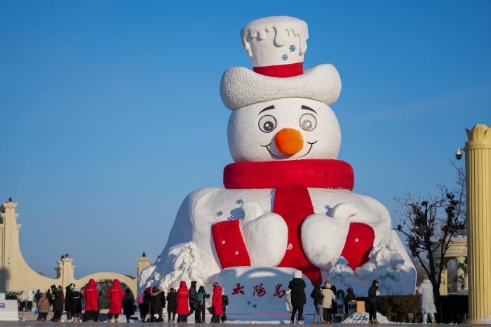1月7日,游客在太阳岛雪博会巨型雪雕“雪人先生”前留影 。