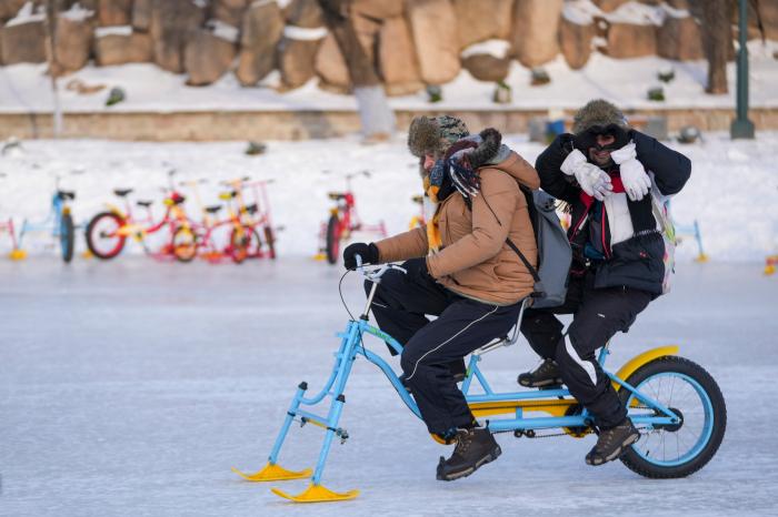 1月8日,外国游客在太阳岛雪博会园区体验冰上自行车。