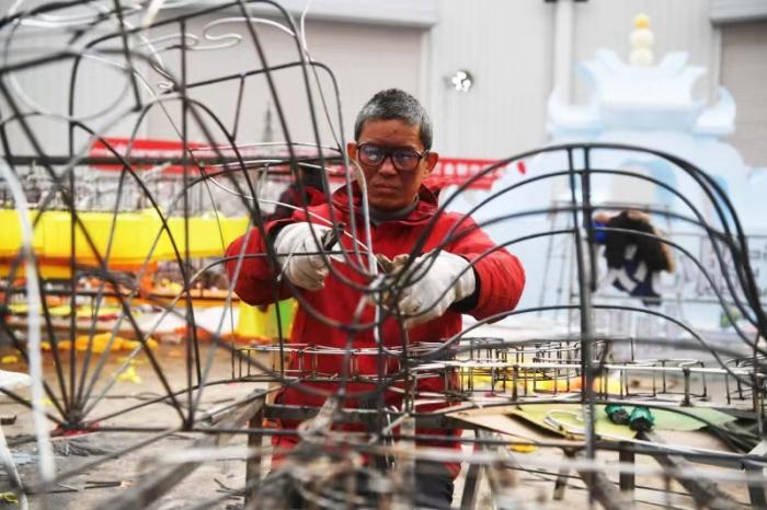 自贡花灯非遗工艺的匠人们正在制作花灯。