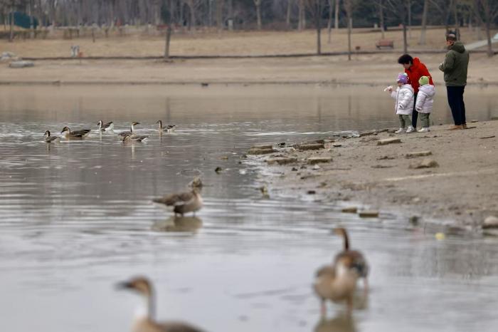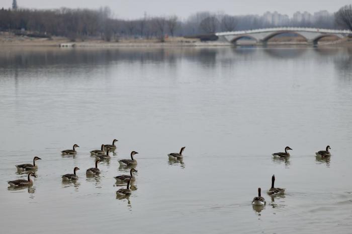 雨水节气过后,气温回升,北京南海子公园迎来首批北归鸿雁。近日,约数十只鸿雁集结于园区湖面,或游弋觅食、或列队滑翔,吸引众多市民与摄影爱好者前来观鸟打卡。