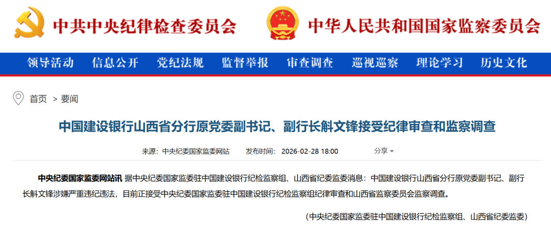 2月28日,中央纪委国家监委官网通报:中国建设银行山西省分行原党委副书记、副行长斛文锋涉嫌严重违纪违法,目前正接受中央纪委国家监委驻中国建设银行纪检监察组纪律审查和山西省监察委员会监察调查。