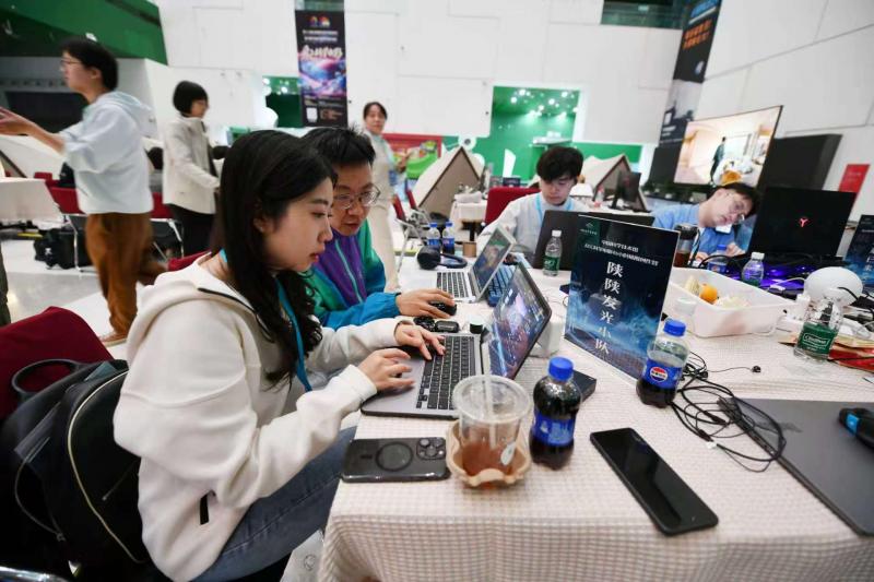 此前,创客营已于3月底完成了为期5天的工作坊,百余名创作者系统学习了从科学推演到AI生成的全流程方法,此次48小时极限创作是对前期学习成果的一次实践。北京青年报记者在现场看到,“陕陕发光小队”成员、来自陕西省科技馆的曲芯仪正在和同伴紧张地创作中。“我们想呈现一部热血群像的动漫风格电影,内容聚焦于2045年脑机宠物推广后,一场宠、人协作飞盘挑战赛的故事。为了做出这样一部40分钟的电影,我们队8个人每人要负责一幕的视频生成,48小时时间还是非常紧张的。”她说。