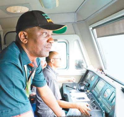 拉各斯的列车驾驶员阿马奥·奥兰莱瓦居正在认真驾驶新列车