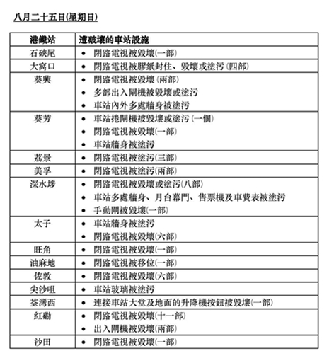 港铁还列出24日及25日车站设施遭破坏清单,涉及20个港铁站,部分为未有关站的车站。受破坏的车站包括观塘、牛头角、彩虹、深水埗、九龙湾、黄大仙、红磡站、葵芳站等。