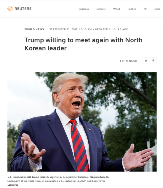 路透社表示,特朗普是在离开白宫时发表上述言论的。此前,朝鲜方面9日曾表示愿意在本月晚些时候重启与美方的会谈。路透社还援引政策分析人士的话说,特朗普本周早些时候撤换国家安全顾问约翰·博尔顿,或有助于美国(与朝鲜)恢复谈判。
