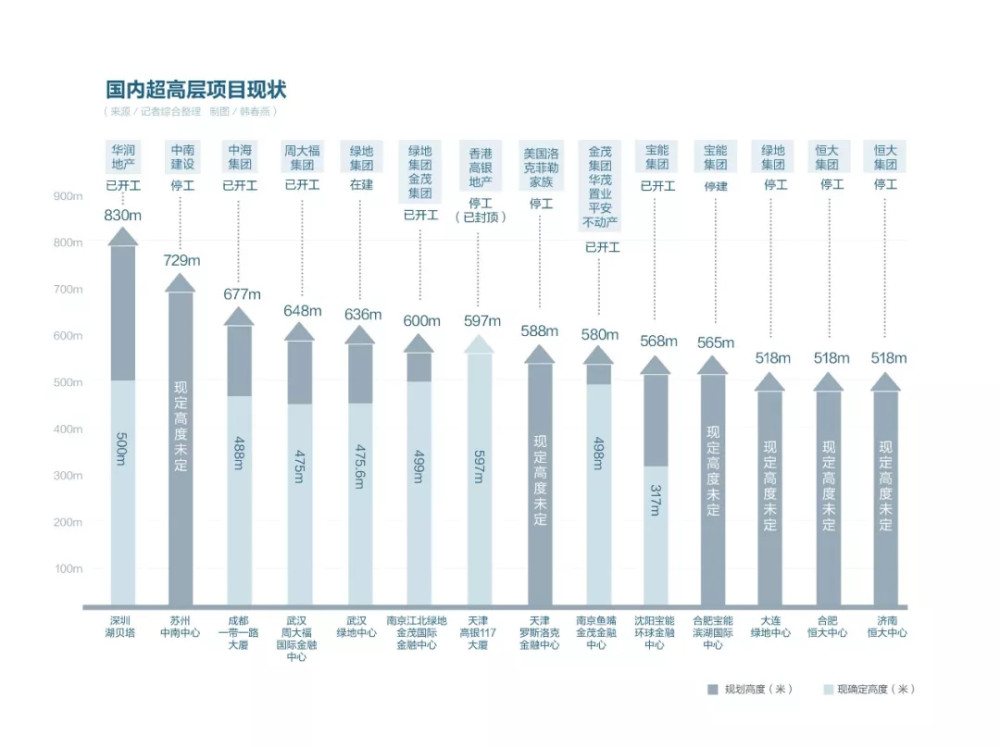 不过,这些宏伟的计划由于成本高昂,很多只留在了过往的文字报道中。武汉绿地中心,是近年来国内摩天大楼“缩水”的样本。去年,武汉绿地中心高度因为民用航空安全问题,最终高度被划定在475米。从那时起,国内摩天大楼建设高度不能高于500米成为一条看不见的“红线”。