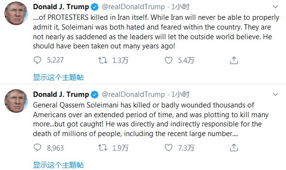 不难看出,特朗普在推特中秉承了一贯的情绪化用词,对伊朗将军的死也没流露任何怜悯。