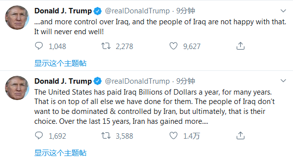 美国每年都要支付伊拉克数十亿美元,已经很多年了,而这(杀死索莱马尼)是我们为他们做的最好的事。伊拉克人民不希望被伊朗统治或控制,但最终,那会是他们的选择。过去15年,伊朗在伊拉克得到了越来越多的控制权,伊拉克人民可不喜欢这样,这不会有好结果!