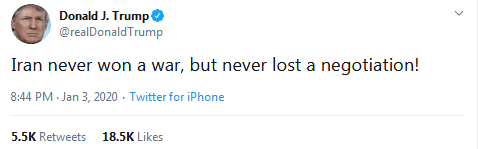 在这些推特发出前,特朗普刚刚发推称,伊朗从未赢得过一场战争,但也没有输掉一次谈判。