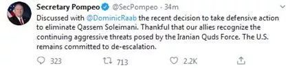 就在特朗普此次发推前不久,美国国务卿蓬佩奥3日一早也发布推文,称美国致力于缓和紧张局势。他在推特表示,他已与英国外交大臣多米尼克·拉布进行交谈。他说:“与多米尼克·拉布讨论了最近的决定——(我们)采取防御行动消灭卡西姆·索莱马尼。感谢我们的盟友认识到伊朗‘圣城旅’构成的持续的侵略威胁。美国仍致力于缓和紧张局势。”