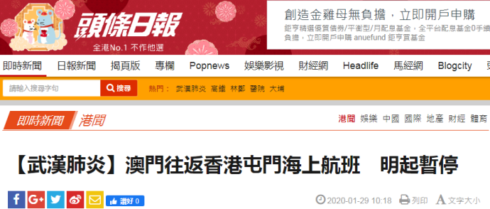 环球网报道 据香港《头条日报》29日报道,为防控新型冠状病毒,减少传播风险,香港海事处将于明日(30日)凌晨起暂停香港九龙及屯门往返澳门外港和凼仔的海上客运航班,直至另行通知。