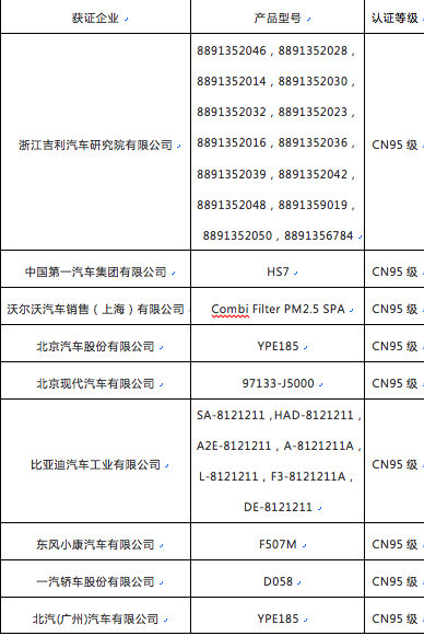 中汽研发布首批汽车空调滤清器CN95认证结果 9家通过