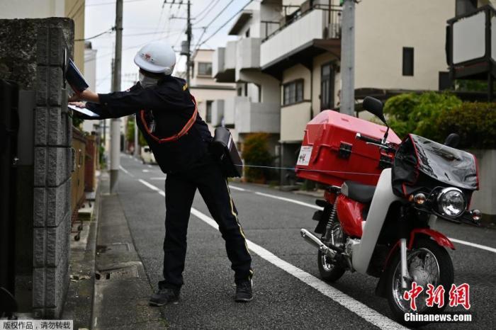 资料图:当地时间4月17日,日本东京一名邮政员工正在向居民派发免费口罩。此前,日本政府做出承诺,向日本每个家庭派发两个可重复使用的布口罩