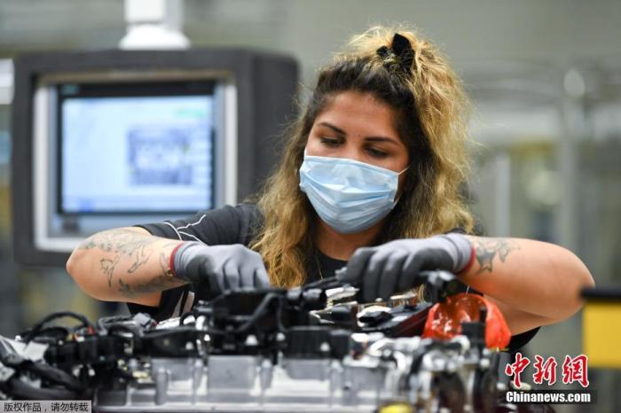 当地时间4月23日,新冠肺炎疫情期间,德国斯图加特附近位于巴德坎斯塔特的戴姆勒动力总成工厂内,一名工人在为奔驰S级车型装配发动机