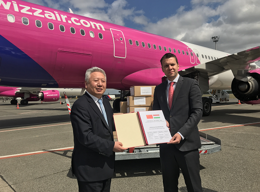 4月29日,中国政府援助匈牙利抗击新冠肺炎疫情物资顺利运抵布达佩斯李斯特·费伦茨国际机场。中国驻匈牙利大使段洁龙、匈外交与对外经济部国务秘书门采尔·陶马什(Menczer Tamás)出席了在机场举行的交接仪式。这批援助物资包括1万份核酸检测试剂、5万只医用N95口罩、10万只医用外科口罩以及1万件医用防护服等。