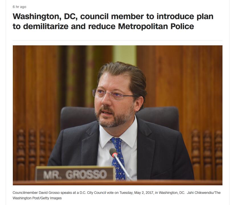 美国非裔男子弗洛伊德遭白人警察暴力执法致死事件引发的抗议席卷全美。继7日事发地明尼苏达州明尼阿波利斯市议会议员承诺启动撤除资助并“解散”警察局的程序后,华盛顿特区议会一名成员也计划于周二(9日)提出4项修正案,以减少警员对军事化装备的使用、同时缩减华盛顿特区大都会警察局的规模。