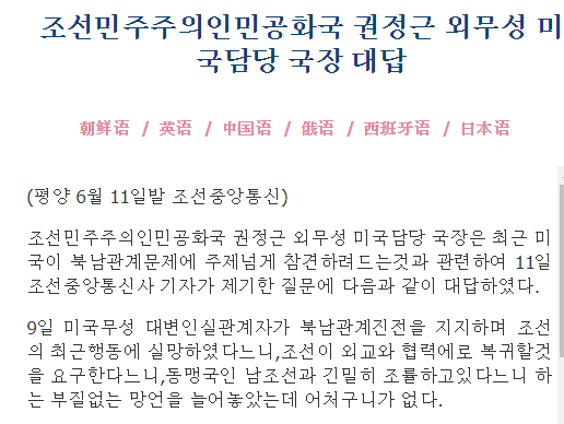 海外网6月11日电 日前,美国国务院发声,对朝鲜切断朝韩通讯联络线表示“失望”。对此,朝鲜外务省美国局局长权正根11日在朝中社回应称,朝韩关系是民族内部问题,美国横加干涉会招致“难以承担的坏结果”。